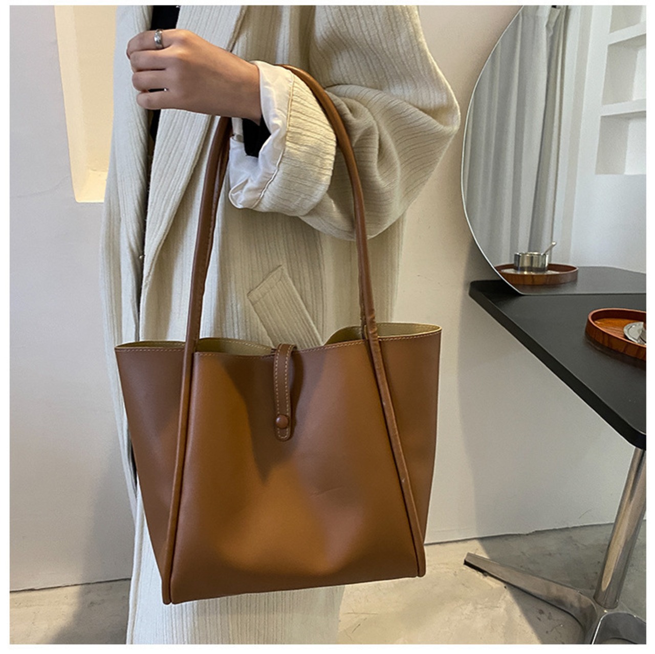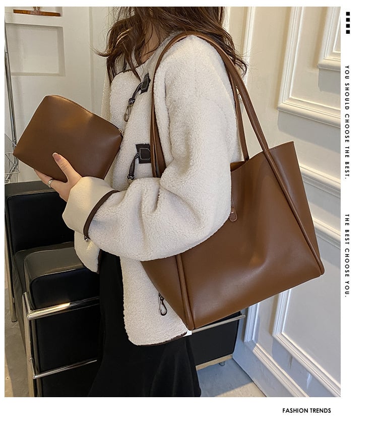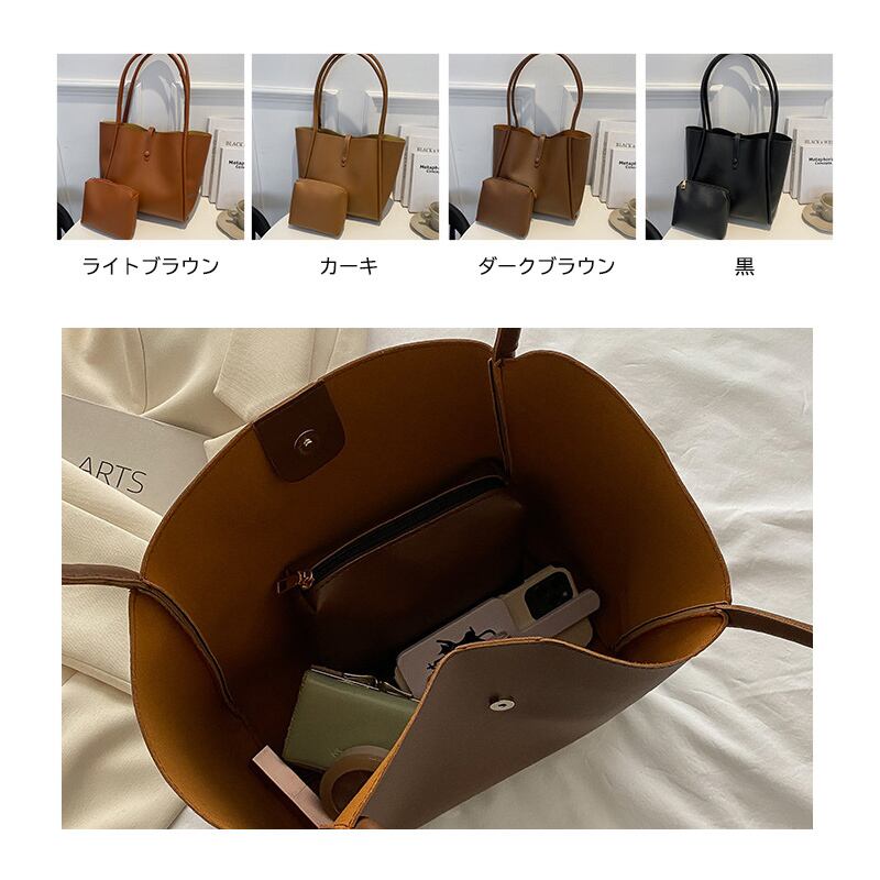 ・同じ素材のポーチつきレザー調トートバッグ。